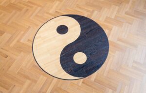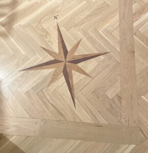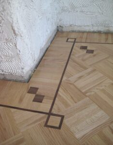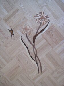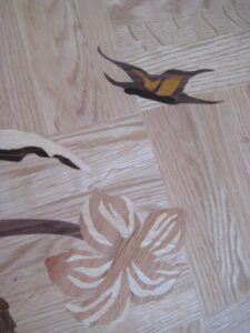 Tammimosaiikki, kalanruotokuvio. Jing-jang vaahteraa ja wengeä.